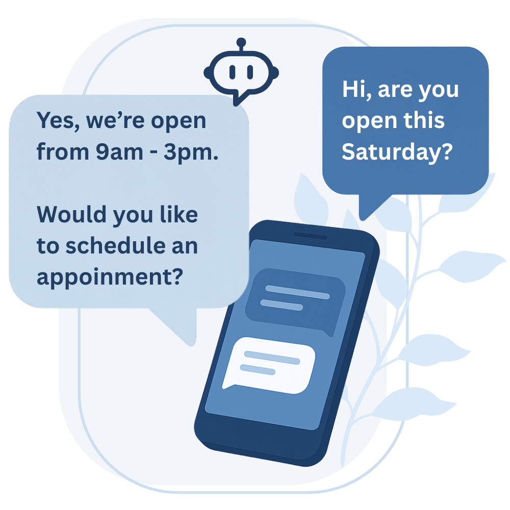 Automated chat replies for FAQs (e.g., hours, services, location)